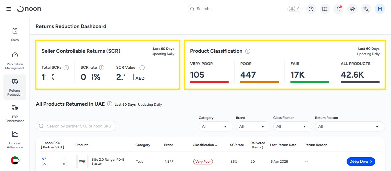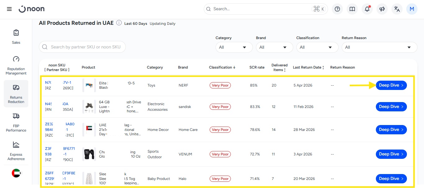 -The Return Reduction Dashboard offers you details about the performance of each SKU with metrics such as its SCR rate, the total number of deliveries, the primary return reason, and its classification as shown in the image below. You can also click on Deep Dive to get more details about the return.
