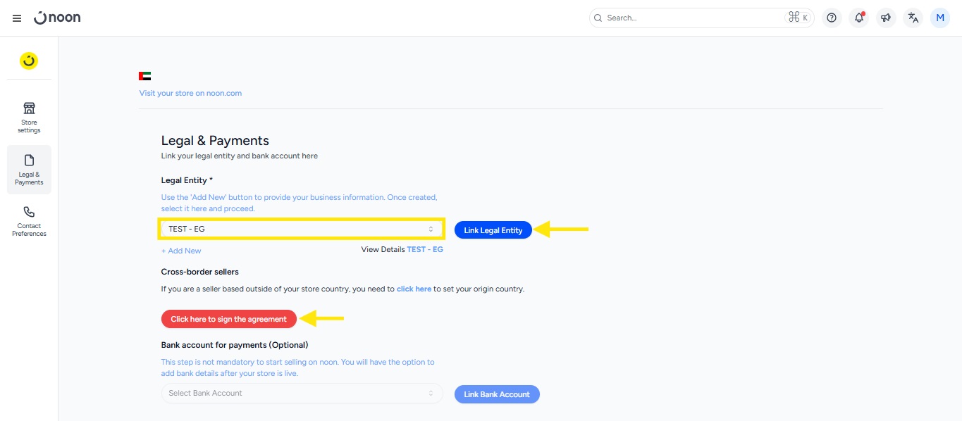 - Link the new legal entity to your store from the Legal and Payment section, select the authorized signatory, and sign the agreement.