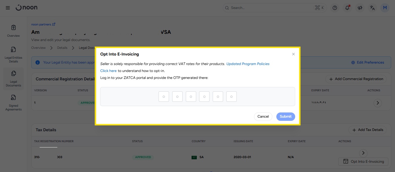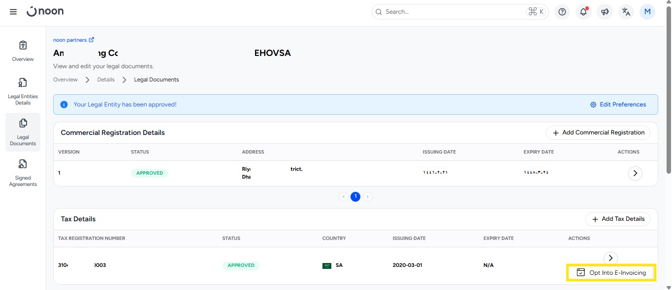- Once your Legal Entity is approved, log into https://finance.noon.partners/en and click on ‘Opt into E-invoicing’ in the Tax Details.